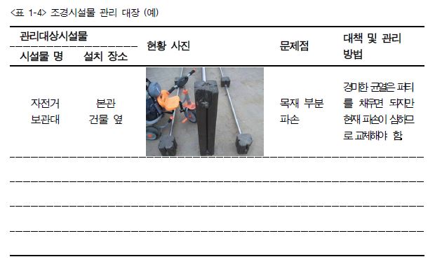 3. 시설물의 관리 작업 시기는 식물처럼 일정한 적기가 있는 것이 아니라 손상 부위가 발견될 시 즉시 보수를 해야 하며, 이용자의 수가 적을 때 실시하거나 장마철 또는 추울 때를 피하여 실시하는 것이 좋다.
