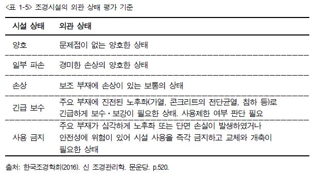 8. 설치되어 있는 조경 시설물을 현장 답사하여 시설물의 외관상태를 파악하고 다음의 평가 기준대로 평가한 후 시설 상태를 판정하고 보수하도록 한다.