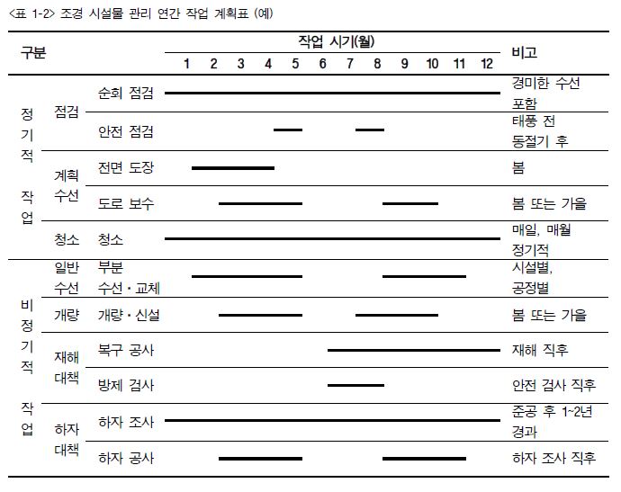 2. 시설물 관리는 우기, 한기를 피하고 이용자 수가 적을 때 실시하는 것이 좋으며 동일한 종류는 종합해서 시행하여야 한다.