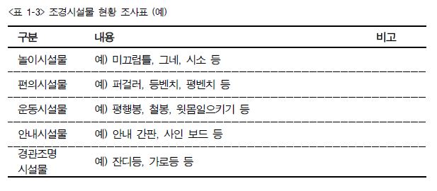1. 설치되어 있는 조경 시설물을 현장 답사하여 시설물의 현황을 파악하고 조사한다.