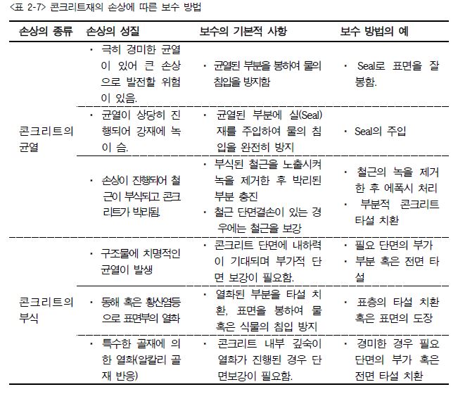 (3) 콘크리트 부분의 보수는 강도에 충분히 견딜 수 있도록 파손 부분을 요철로 깎아 내고 물로 씻어 낸 후 원설계와 같은 배합의 콘크리트를 타설한다.