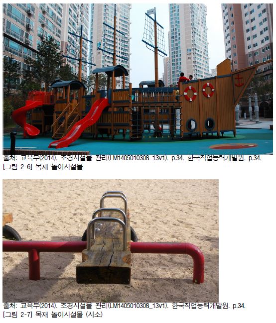 (1) 목재 놀이시설물은 감촉이 좋고 외관이 아름다워 사용율이 높지만 금속재보다 부패되기 쉽고 잘 갈라지니 사용 시에 주의해야 한다.