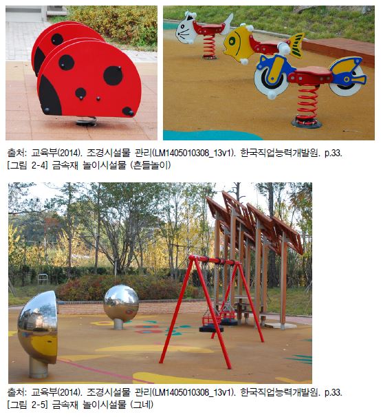 2. 놀이시설물의 종류에는 그네, 시소, 회전무대, 정글짐, 철봉, 수평대, 미끄럼틀, 조합 놀이대, 미로, 놀이벽, 조각 놀이대 등이 있다.