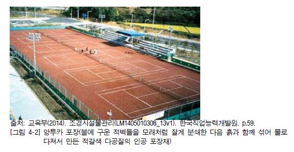 2. 앙투카 포장은 비 온 후 한 시간만 지나도 경기를 할 수 있다는 장점이 있지만, 너무 건조하면 붉은 가루가 날려 운동장 사용자의 건강에 해롭기 때문에 물을 뿌려 롤러로 진압해 주는 것이 좋다.