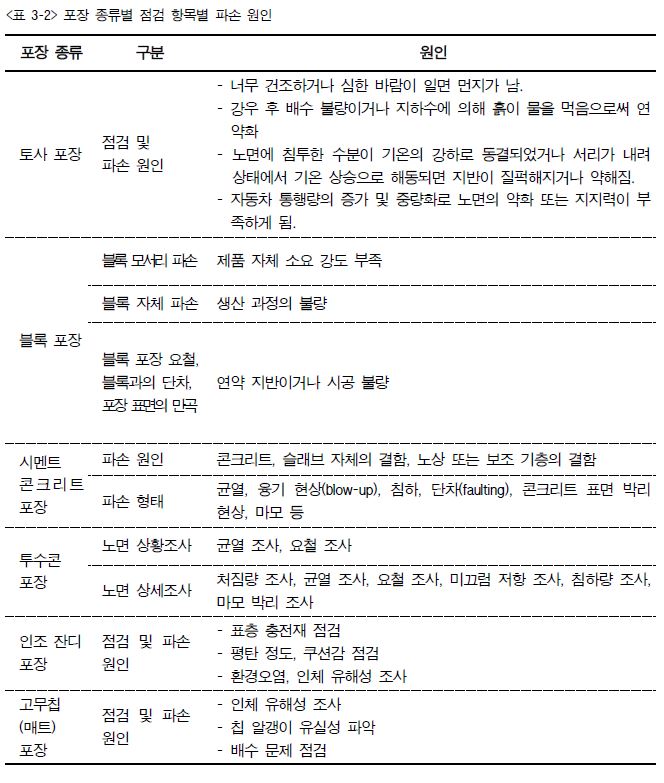 3. 포장시설의 이용형태와 이용 강도를 점검하여 포장 재료의 존치(유지) 또는 변경(교체 또는 보완) 등을 검토한다.