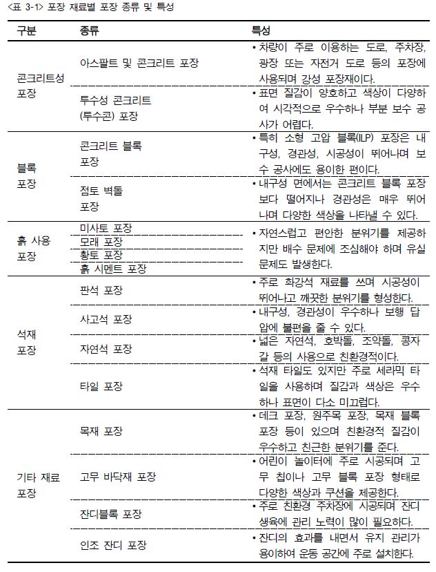 1. 포장 재료는 관리용 도로, 보행자 도로, 자전거 도로, 놀이 및 운동 공간 등 용도별로 다양하게 쓰일 수 있고, 인공 재료와 자연 재료로 구분할 수 있다. 또 포장 공사 시 시공 방법에 따라 현장 시공형과 제품 설치형으로 분류할 수 있다.