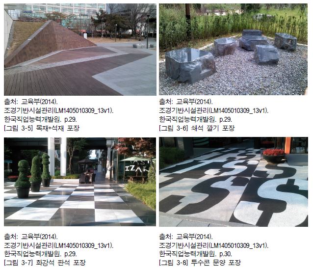 2. 포장 재료는 조경공 간에서의 포장의 기능에 따라 달라지며 이용자의 시각적인 측면도 고려하여 결정된다. 특히, 조경용 포장 재료는 차량보다는 보행자가 안전하고 쾌적하게 공간을 이용할 수 있도록 재료를 설정해야 하며 경관적으로 우수하면서도 유지 관리비가 적게 드는 방향으로 결정되어야 한다.