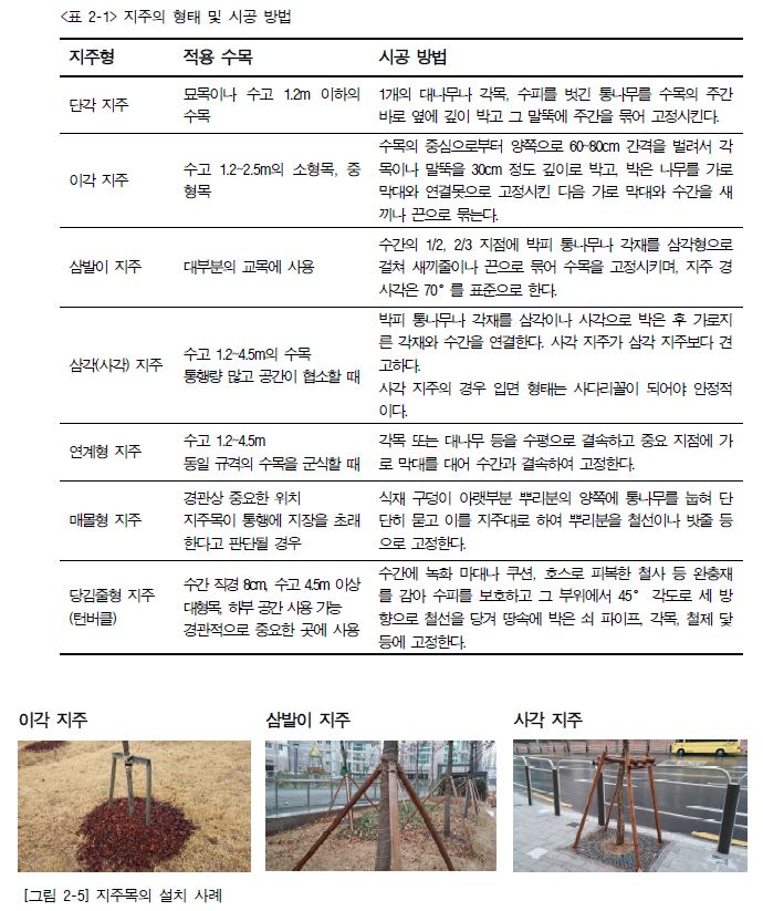 (1) 식재 수목의 규격과 식재 위치 및 방법에 따라 단각 지주, 이각 지주, 삼발이 지주, 삼각 지주, 사각 지주, 당김줄형 지주, 연계형 지주, 매몰형 지주 등이 있다.