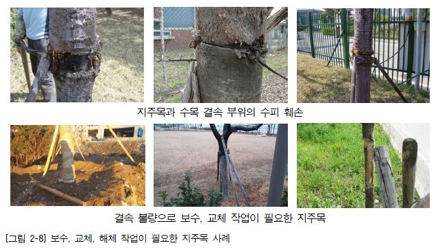8. 버팀목의 결속 불량으로 전도 우려가 있거나 버팀용 목재가 부패한 경우, 태풍이나 강풍으로 인하여 수목의 전도가 예상되는 경우에는 결속 부위를 수선하되 수피에 손상을 주면 안 된다.
