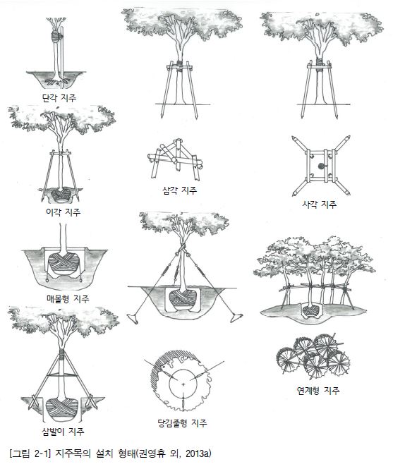 (1) 식재 수목의 규격과 식재 위치 및 방법에 따라 단각 지주, 이각 지주, 삼발이 지주, 삼각 지주, 사각 지주, 당김줄형 지주, 연계형 지주, 매몰형 지주 등이 있다.