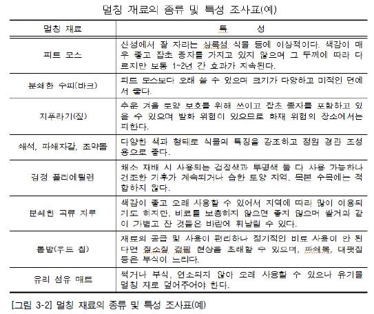 • 대상 장소에 적합한 멀칭 재료의 선택으로 경관의 향상 효과를 얻을 수 있다.