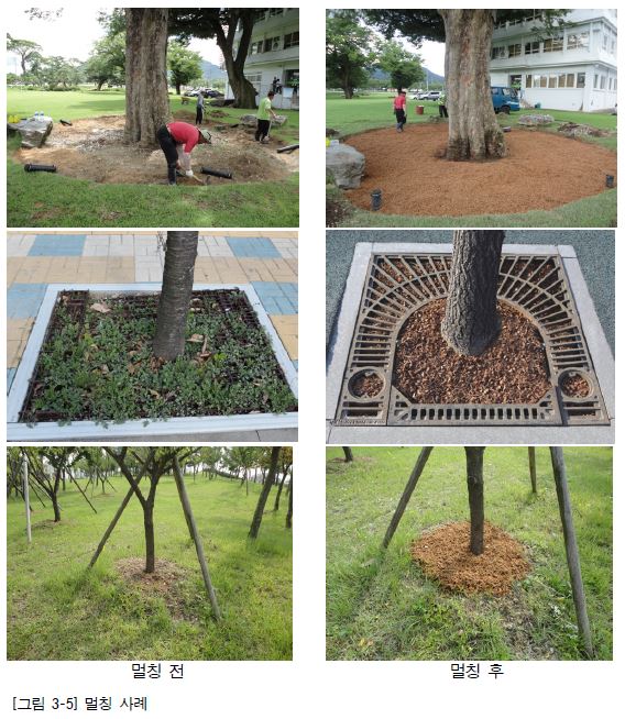 (2) 봄철에 멀칭이 지속될 경우 토양이 천천히 데워져서 멀칭이 없는 곳보다 생장이 지연되므로 햇빛에 노출될 수 있도록 수목 주변의 멀칭을 제거한다.
