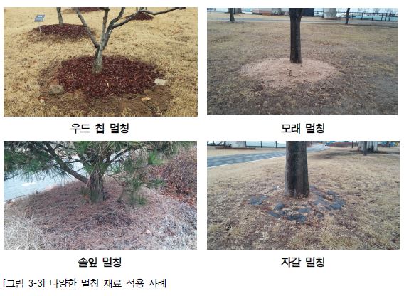 2. 대상 수목과 식재 대상 지역의 특성, 환경에 적합하고 주변과 어울리는 멀칭 재료와 방법을 선택한다.
