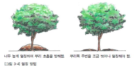 4. 수간과 근원부에 대한 설치류의 피해가 증가할 수 있으므로 수간이나 근원부에서 조금 떨어져 멀칭한다.