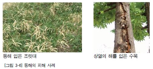 (1) 동해: 기온이 빙점 이하로 내려갈 때 나타나는 식물의 피해로 상록 활엽수의 경우 잎의 끝과 가장자리가 괴사하여 갈색을 띄게 된다.
