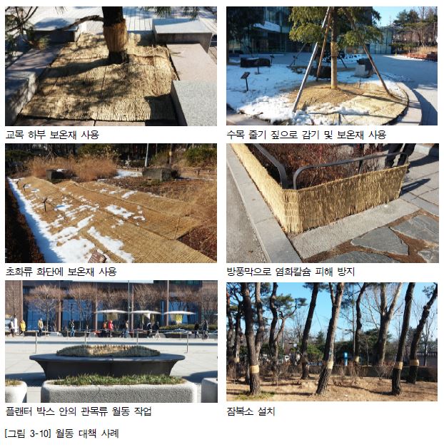 월동 작업은 이식 수목이 겨울철 환경에 적응할 수 있도록 하기 위해 월동에 필요한 조치를 하는 것이다.(이경준․이승제, 2002)
