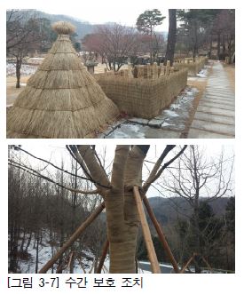 (3) 내한성이 약한 수종은 수간을 볏짚이나 새끼 끈으로 싸 주고, 상열을 막기 위하여 유지나 녹화 마대로 수간 전체를 감싼다.