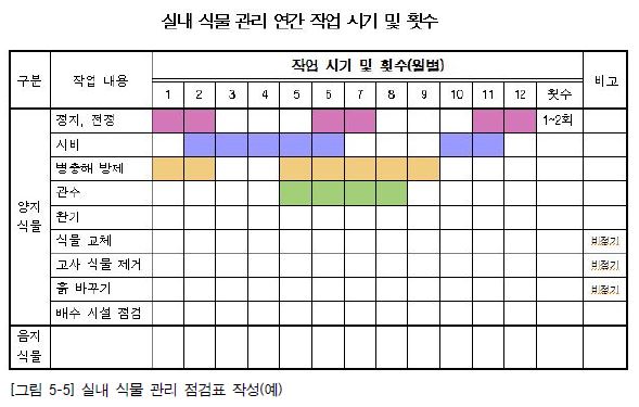 3. 식재된 식물의 정지와 전정, 시비, 병충해 방제, 관수, 식물 교체, 고사 식물 제거, 흙 바꾸기, 배수 시설 점검 등의 연간 작업 계획을 세우고 관리한다.