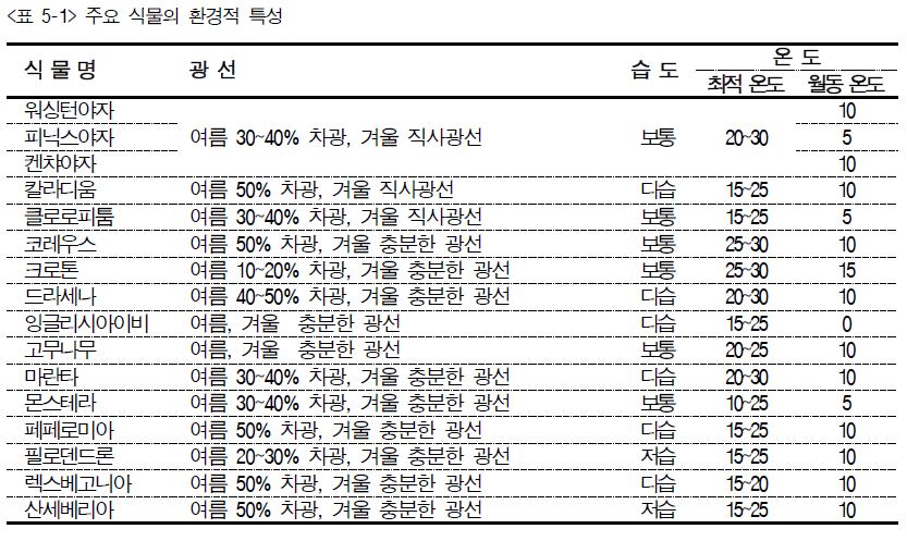 (가) 식물이 살아가는 데 알맞은 온도는 낮에는 23~25℃, 밤에는 16~18℃를 유지하는 것이 바람직하다. 그리고 겨울철이라도 10℃ 이상은 유지되어야 하고, 여름철에는 30℃ 이하가 되도록 한다.
