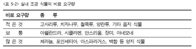 3. 실내 조경 식물의 비료 요구량은 다음과 같다.