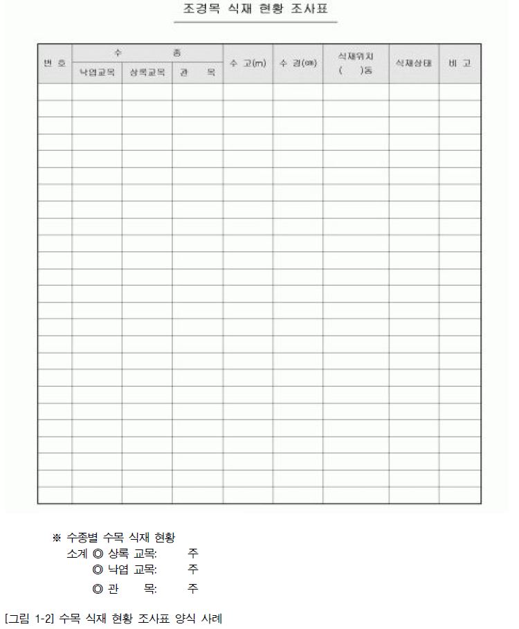 1. 대상 지역 수목을 생태적 분류 방법에 의거하여 조사한다. 조사할 항목은 수목명과 함께 수고, 수관 폭, 흉고 직경, 근원 직경, 수관 길이 등을 조사한다.