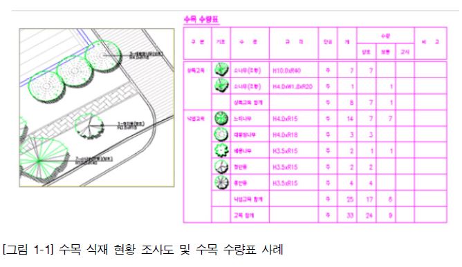 수목 식재 현황 조사도 및 수목 수량표