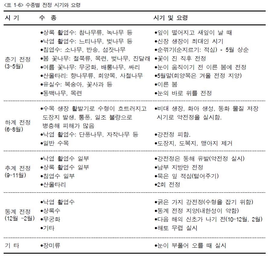 생육 절기, 화아 분화 시기, 수목 유형에 따른 전정 시기를 종합해서 계절별로 전정하게되는 대표적인 수종과 전정 요령을 정리하면 다음 표와 같다.