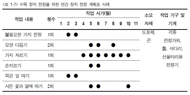 3. 정지 전정 목적에 따라 정지 전정 대상과 정지 전정 시기를 월별 단위로 연간 정지 전정 계획표를 작성한다.