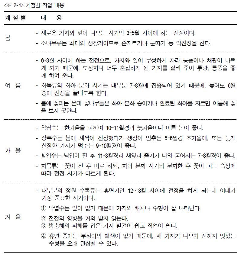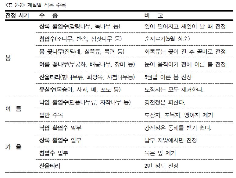 (1) 새싹이 빠른 수종은 전정 시기를 빨리 끝내고, 늦은 수종은 늦게 해도 된다.