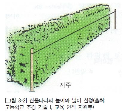 2. 산울타리의 높이와 폭을 일정하게 하기 위하여 지주를 세우고 수평줄을 친다.