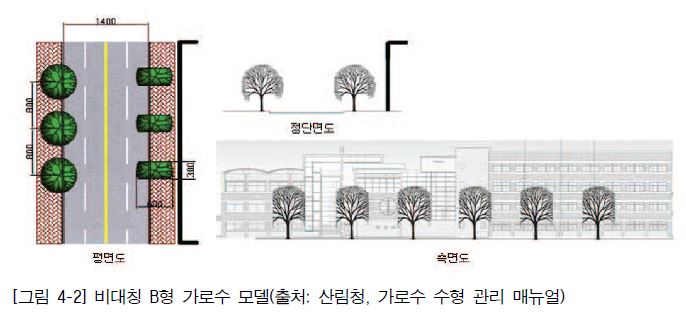 2. 비대칭 B형: 보도 폭은 충분하나 가로수로 인하여 상가 간판이 가려 민원이 발생하는 곳은 가로수와 가로수 사이의 수관 폭을 정상 수관 폭보다 1/2로 좁게 관리하여 시계 차단의 피해를 방지할 수 있다. 이 비대칭 B형은 지방의 농경지에 일조권 피해를 유발하여 민원이 발생할 경우에도 적용한다.