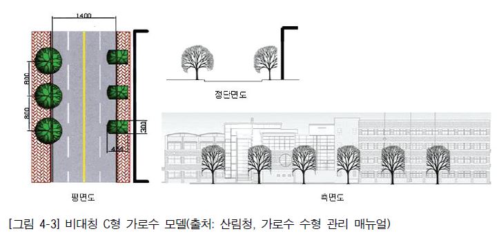 3. 비대칭 C형: 보도 폭도 좁고 상가 건물의 간판을 가려 민원이 발생하는 경우, 가로수와 가로수 사이의 수관 폭을 1/2로 줄이고 아울러 보도 쪽의 수관 폭도 현장 여건에 부합하도록 축소한다.