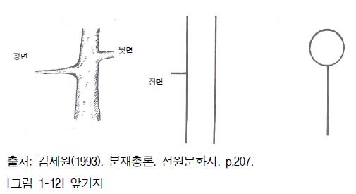 (1) 수목은 살아있는 생물이어서 각 방향에서 바라보는 모양이 일정하지 않으므로, 뿌리와 줄기의 연결부분, 줄기의 흐름, 가지의 배치, 수목 상부의 기울기 등을 고려하여 가장 보기 좋은 방향을 정면으로 결정한다.