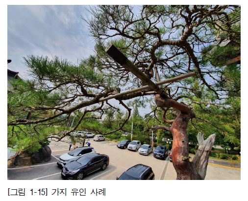 2. 수평보다 높은 각도로 자라는 가지는 수형연출 방법을 활용하여 수평 아래로 내려줄 수 있으며, 대상 수목의 수종 특성, 크기, 생육 상황을 고려하여 가지 유인, 대걸이, 철사걸이 중에서 적합한 수형연출 방법을 선택한다.