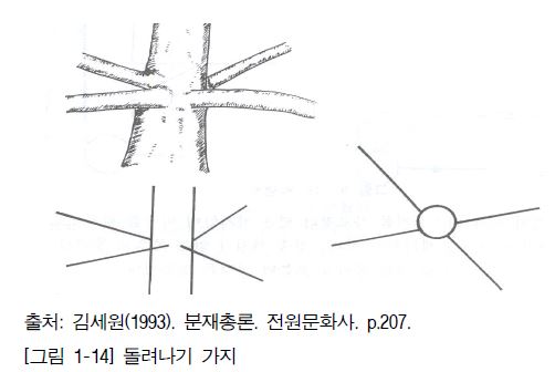 줄기에서 생성된 위 가지와 아래 가지가 가까운 간격으로 평행을 이루면서 형성된 가지이다. 목표 수형과 위ㆍ아래 가지, 전후ㆍ좌우 가지의 배치를 고려하여 제거할 가지를 선정한다.