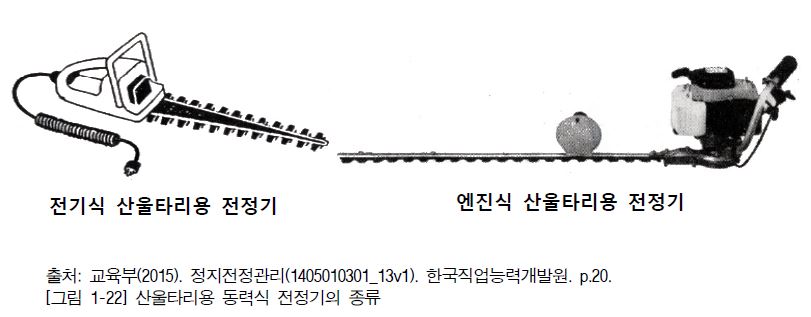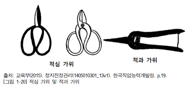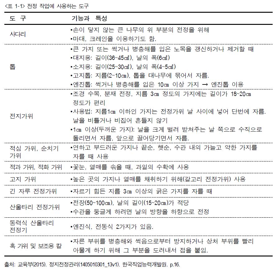 정지전정 작업 도구에는 사다리, 톱, 전지가위, 적심 가위, 순치기 가위, 적과 가위, 적화 가위, 고지 가위, 긴 자루 전정가위, 산울타리 전정가위, 동력식 산울타리 전정기, 혹 가위 및 보조용 칼 등이 있다. 기능과 특성은 아래 <표 1-1>과 같다.