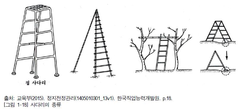 1. 사다리 등 작업용 지지 도구의 크기, 재질, 종류를 작업 유형 및 규모에 맞게 선정하고 준비한다.