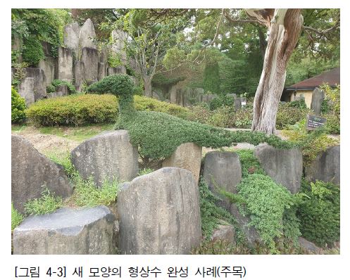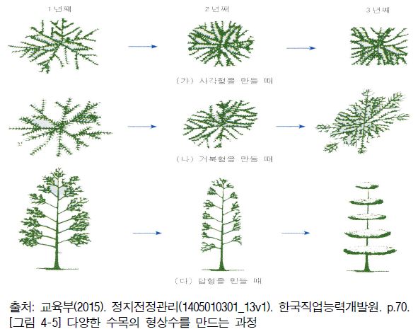 2. 전체 수형의 중심 부분을 조성하기 위해서 우선 원형, 원추형, 타원형 등으로 대상 수목의 수형을 만들며 이 후 필요한 가지는 성장시키고, 불필요한 가지는 제거하는 방법으로 형상수의 수형을 만든다.
