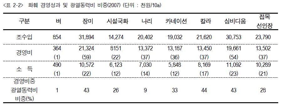 화훼는 대부분 시설을 이용하며 시설화훼는 고소득 작목이지만 또한 고비용 농업 작목이다. 특히 경영비중 광열동력비 비율 장미, 칼라, 심비디움 등은 40% 이상, 카네이션, 접목 선인장, 국화는 각각 30% 내외를 점유할 정도로 광열 동력비의 비중이 크다. 따라서 시설화훼의 경영성과 구조는 외부요인에 따른 경영의 불안정성이 존재한다.