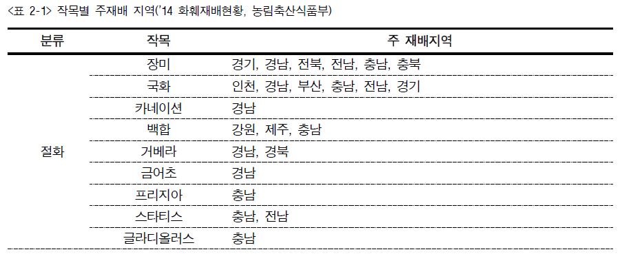 화훼류는 대부분 시설에서 재배하며 연중생산을 위하여 보온시설과 난방시설을 갖춘다. 지역별로 품목별로 보온방법과 난방열원의 종류 등에 대하여 조사한다. 또한 지역별로 토경재배 또는 수경재배 등 재배유형 등에 대하여 조사한다.