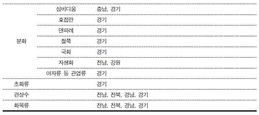 화훼류의 연도별 지역별생산현황과 생산액 농림축산식품부에서 조사할 수 있다. 부류는 대부분 절화류, 분화류, 초화류, 관상수류, 화목류, 종자 종묘류, 구근류로 나누어서 조사한다.