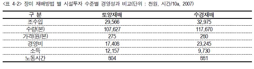 장미의 경우 저비용의 토양재배가 수경재배보다 10a 당 소득 25% 높다. 장미 토양재배는 수량 가격에서 수경재배에 비해 낮아 조수입이 수경재배의 90% 수준으로 낮으나 경영비는 수경재배의 75% 수준으로 적게 소요되어 소득이 높다. 토양재배와 수경재배의 비용차이가 큰 비목은 경영비 중 가장 큰 비중을 차지하는 광열동력비(43%), 영농시설 상각비(16%) 등이다.