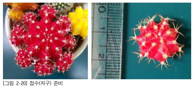 선인장의 대목을 손질하고 접수와 대목의 유관속이 일치하는지 확인한다. 접붙이기 후 접붙인 부위가 흔들리지 않도록 주의한다.