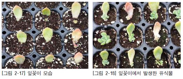 1. 영양 상태가 좋은 잎을 따서 통풍이 되는 음지에서 겹치지 않도록 하여 2~3주간두면 뿌리가 나오고 잎의 아랫부분에서 작은 식물이 형성되도록 한다.