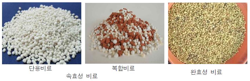 비료의 형태에 따라 고체비료, 액체비료(액비) 및 기체비료(탄산가스)로 나누어지며, 비료의 주성분에 따라서는 질소질 비료(요소), 인산질 비료(용성인비), 칼리질 비료(염화칼리) 및 유기질 비료(퇴비) 등으로 나눌 수 있다. 비효의 지속에 따라 요소 및 염화칼리 등과 같은 속효성 비료, 퇴비와 같은 완효성 비료로 나눌 수 있다.