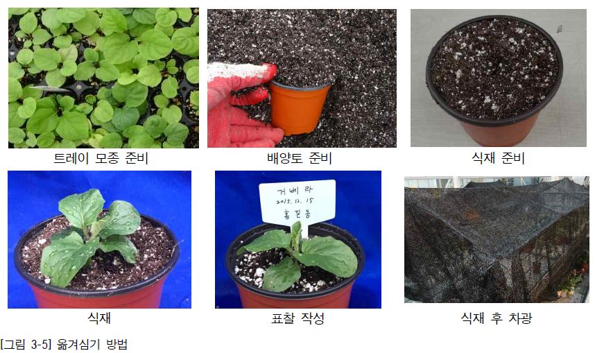 (2) 뿌리가 상하지 않도록 모종과 흙을 분리시킨다. 준비된 모종은 강한 햇볕을 피하여 시들거나 뿌리가 마르지 않도록 한다.