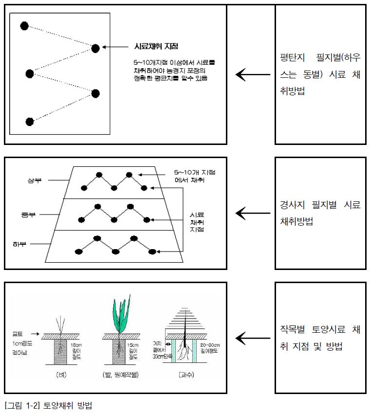 재배하는 작물, 재배형태, 지형에 따라 토양채취 방법이 다르므로 이를 잘 지켜서 채취해야 한다.