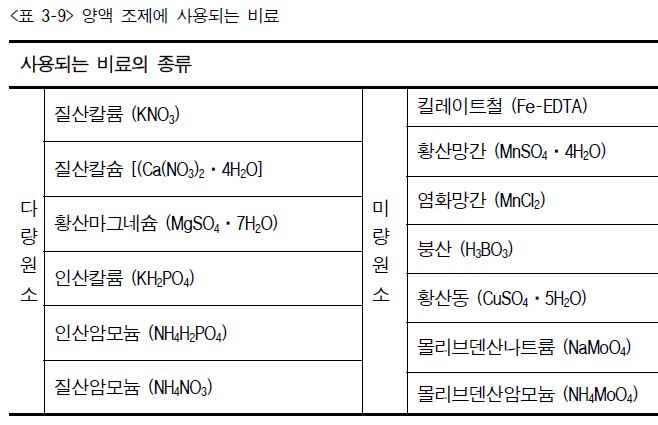 1. 재배하고자 하는 품목의 양액 조성표를 구한다.
