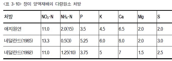 (가) 장미 양액재배의 다량원소 처방(비순환식) (단위 : me/ℓ)