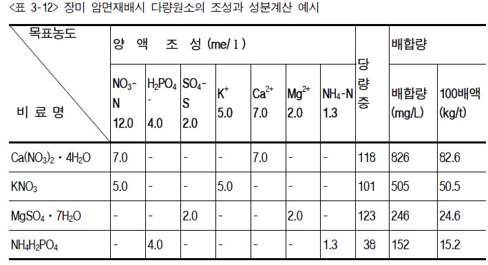 (5) 원수중의 Ca, Mg 등은 ppm을 me/L단위로 환산하여 그것을 목표농도(me/L)에서 빼서 수정 목표농도를 구하고, 필요한 비료량을 계산한다.